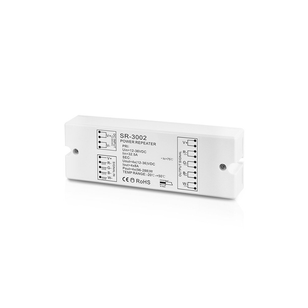 Zesilovač Sunricher SR-3002 je doplňkový sortiment pro LED ovladače a stmívače a slouží pro zesílení signálu pro CCT, RGB, RGBW LED pásků. LED zesilovač se používá k posílení výkonu napájení v momentě, kdy celková velikost instalace osvětlení nebo délka zapojení LED pásku překračuje nominální hodnoty LED ovladače/stmívače LED pásku.