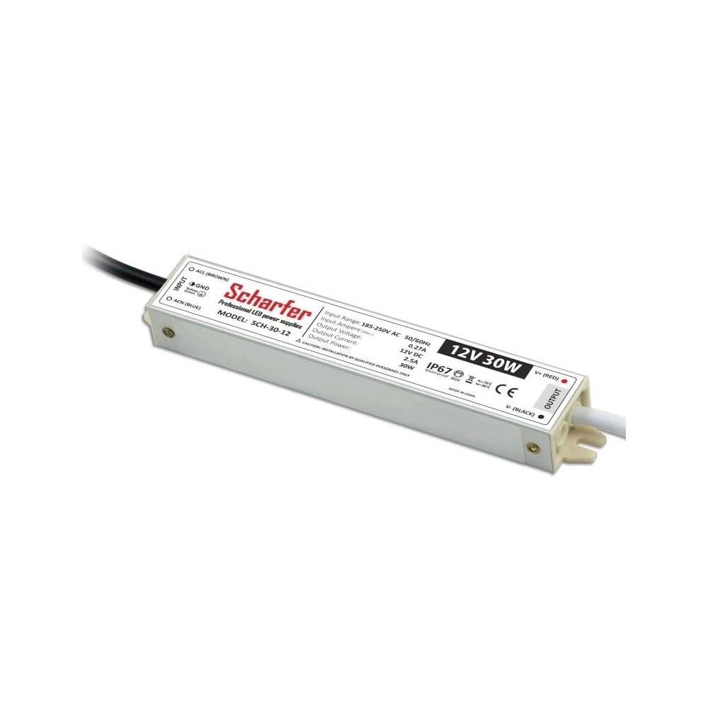 Profesionální a kvalitní LED zdroj Scharfer pro LED pásky a LED moduly 12V o výkonu 30W. Jedná se o voděodolný, venkovní, elektronický spínaný zdroj do exteriéru a vlhkého prostředí s krytím IP67.