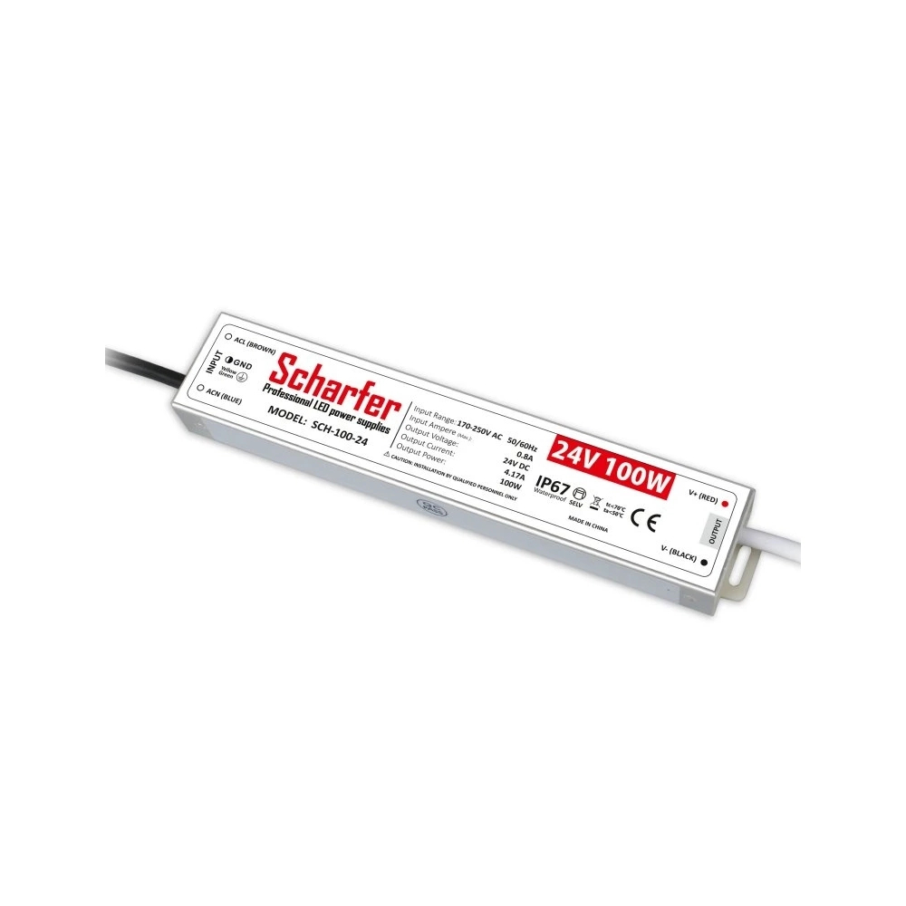 Profesionální a kvalitní LED zdroj Scharfer pro LED pásky a LED moduly 24V o výkonu 100W. Jedná se o voděodolný, venkovní, elektronický spínaný zdroj do exteriéru a vlhkého prostředí s krytím IP67.